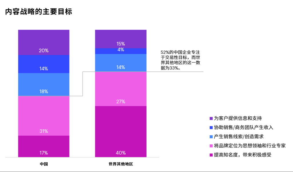 可计算的营收和销售线索仍旧是营销人员评估内容策略成果的重要指标。在中国,52%的公司将交易性目标(如销售线索、营收增长、客户支持等)视为内容策略的主要目的。但是,越来越多的公司已经转向以品牌为主导的方法。几乎一半的公司(48%)表示,他们将品牌建设目标(如品牌知名度和感受、思维领导等)视为主要推动因素。