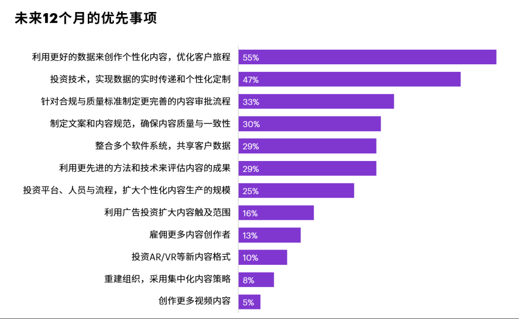 当我们询问企业未来12个月在内容策略方面的优先事项时,中国企业将“利用数据创造更为个性化的优秀内容”视为首选。