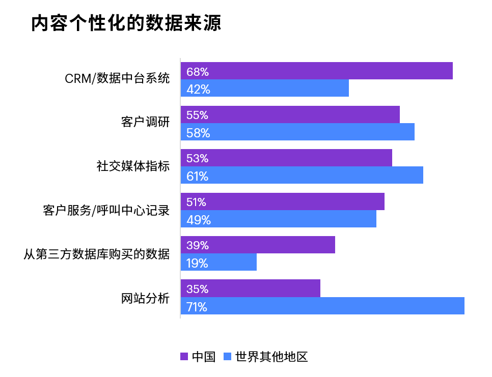 与此同时,他们也在迅速增强内部能力,以实现相应目标。68%的受访公司已不再依赖于独立的数据源,进而采用CRM等数据中台系统来帮助针对不同客户群体创作独特内容(世界其他地区这一比例为42%)。