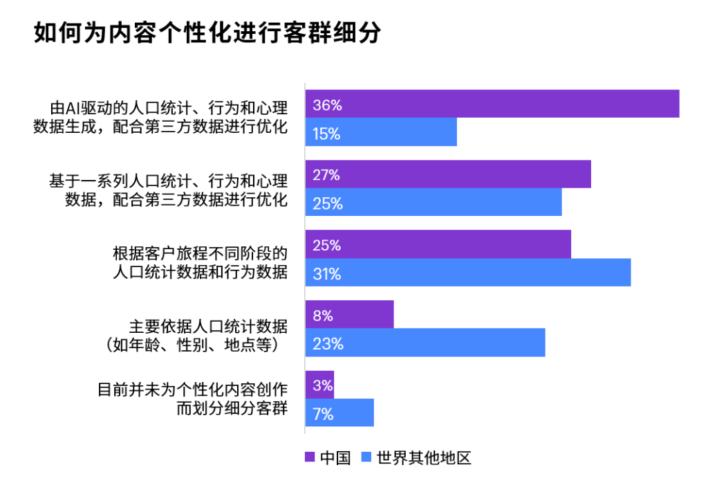其次,中国企业已经意识到,千篇一律的内容已不在足够。为了满足客户对高质内容日益增长的需求,企业正在强化内部能力,充分利用数字数据,针对不同客户群体创作个性化内容。