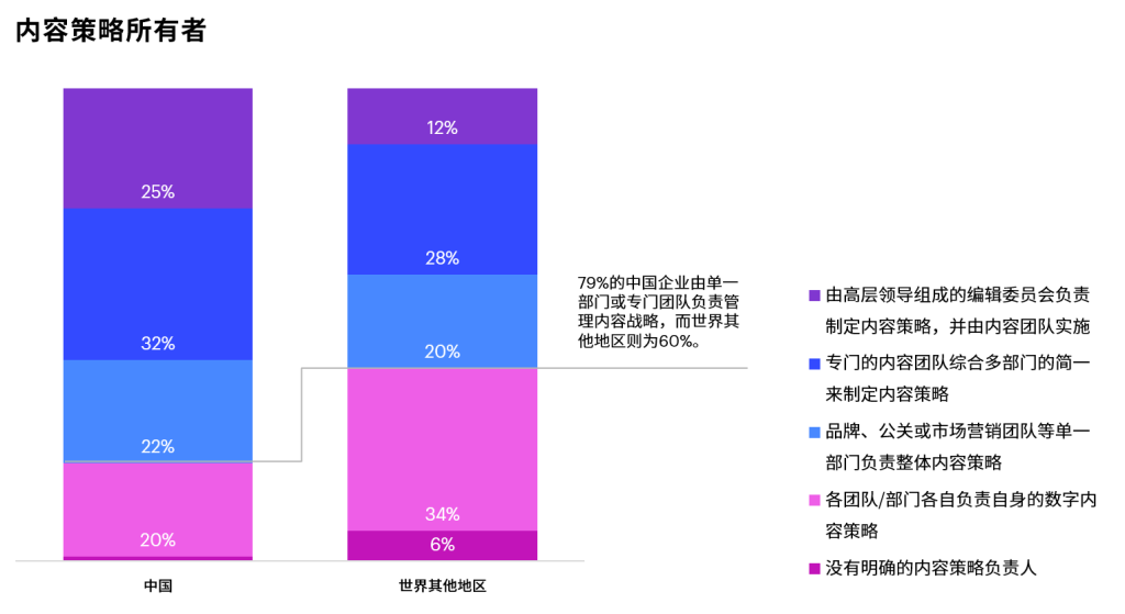 由于大部分中国企业仍采用层级化的传统管理模式,且大多企业仍处于内容策略制定的初期阶段,内容管理通常是一项集中化职能。