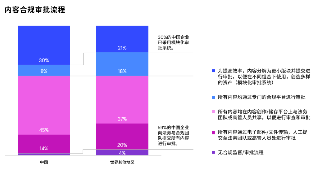 但这一高度集中的层级化管理模式可能会阻碍内容创作的速度。59%的中国企业仍需向法务与合规团队提交所有内容进行审批。